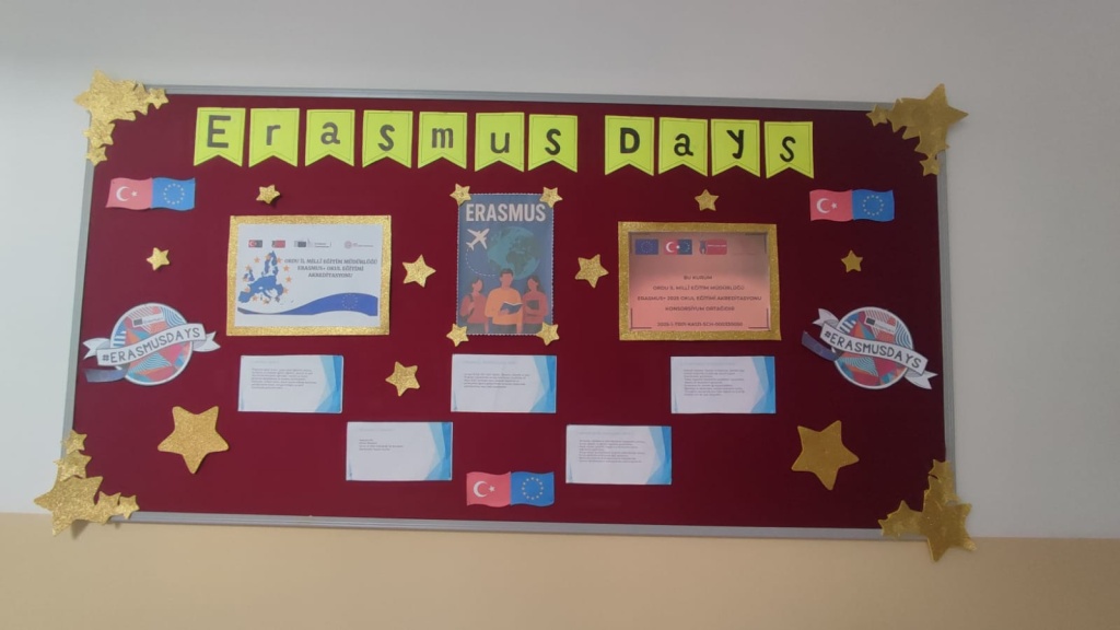 Bu kapsamda, Erasmus projeleri hakkında bilgilendirme yapmak, Erasmus+ tecrübelerini aktarmak ve projelerini geniş kitlelere tanıtmak adına 14-19 Ekim tarihlerinde tüm dünyada kutlanan Erasmus Days için okulumuzda pano hazırladık.